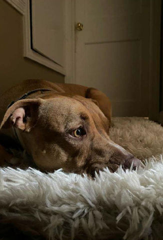 Dolce is a total doll and such a love bug. She's not even two years old, weighs about 40 pounds, and adores cuddling under blankets. She can't get enough of her orange ball, which she chews like gum. Tug of war is a whole lot of fun, too. And water? Oh, yes, please! Dolce looooves water. She might even be part duck!