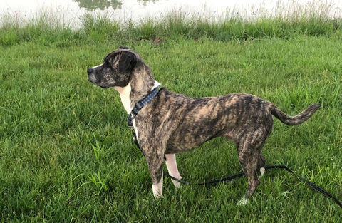 Griffin came to stay with us from our friends at Dog Gone Rescue for a little training. He's a three-year-old boxer mix with a derpy, adorable face and the cutest snaggle tooth ever.